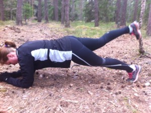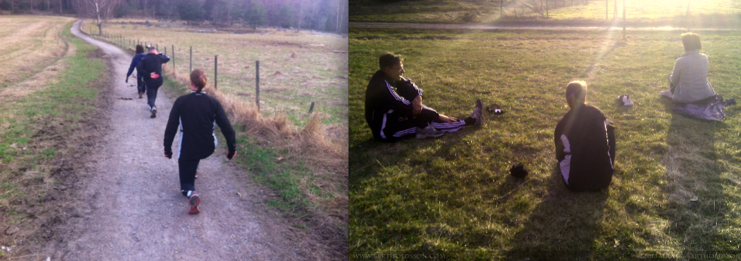 Det var som att slängas mellan två klimatzoner idag. Lite ruggigt och skuggigt vid start, men oh vilket avslut! Vi joggade upp i skogen direkt och stannade till i gläntan. Komboövning – 10 plankan med benlyft + 10 upphopp i i 2×2 min. Därefter 2×40 sek småsint-ups. Sedan joggade vi vidare ner emot bänken och körde 3×20 dips. Upp på mountainbikespåret ända bort till Mullekojan.