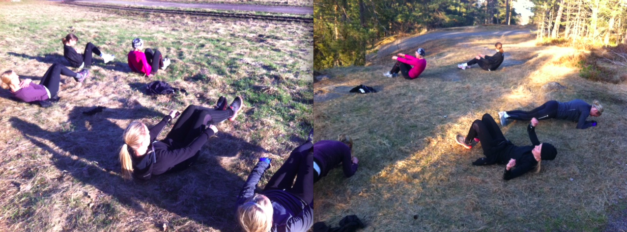 Dagens pass hade fokus på bålen och en punktmarkering på lår. Vi joggade upp på spåret mot soliga backen, halvvägs stannade vi till och körde 3×45 sek knäklappskamp, bra flås och snabba fötter. Vid soliga backen började vi med 2×2 min 10 armhävningar + 10 djupa hopp. Därefter 3×45 sek plankan med benlyft och 2×45 sek fällkniven. Självklart strålande kvällssol även denna afton. Vi joggade vidare till nästa stopp, här körde vi 2×40 sek dips i par. Lagom möra i armarna var det dags att ta sig ner bort emot gamla slalombacken. Vi joggade utmed Ekholmsnänssjön och väl framme pausade vi kort för att samla kraft. Det blir mycket mjölksyra i låren av denna branta men roliga backe. Sista metrarna gör det ont och motoriken i benen är inte riktigt optimal, men det är en bra investering.