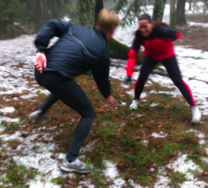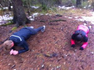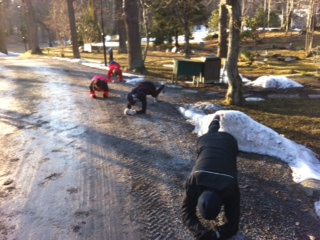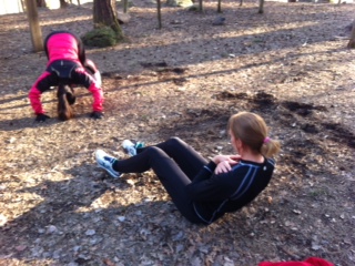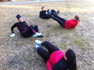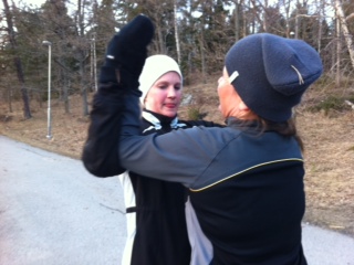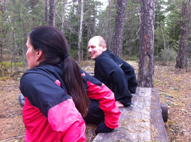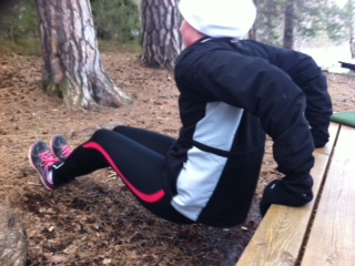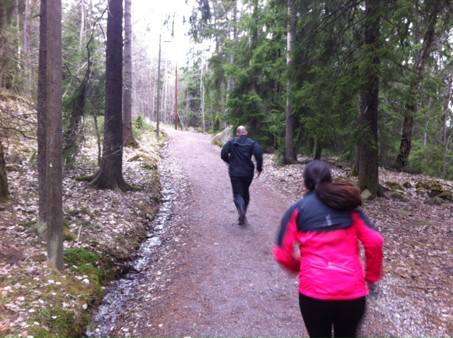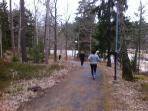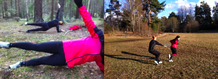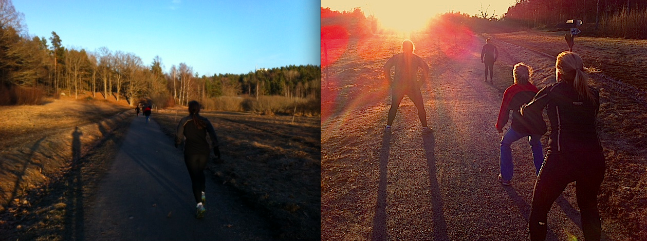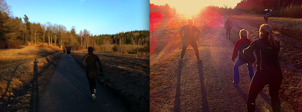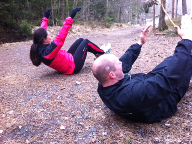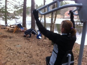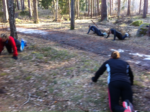 I ljummen kvällssol joggade vi upp emot utegymmet där vi körde uppvärmningsserien 10 plankjacks-10 plankjogg-10 djupa hopp. Sedan direkt på stationer 2×45 sek småsint-ups och 2×45 sek axelpress, därefter 2×45 sek rygglyft med klapp och 2×45 sek hästlöpning. Den sistnämda är en riktig pulshöjare så efteråt lufsade vi upp på spåret. 2×30 m grodhopp.Efter dessa en tur rakt in i skogen, första för säsongen. Det är något speciellt med löpning i skogen och otroligt kul!!! Inne i skogen kom den efterlängtade plankserien med konstaterandet att “det känns lättare nu”-Superkul!!! Väl uppe på spåret kom pulstoppen, kurirstafett. Här kom farten upp rejält vilket är grymt! Jogg tillbaka till spårtavlan och stretch.