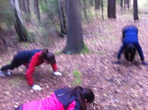 Vi fortsatte joggen genom skogen upp på vägen igen. Här lade vi oss på led och körde militärmarsch. Den är inte tokjobbig, men ett kul sätt att ta sig fram på. Så var det dags att sticka in i skogen igen för vårt andra styrkestopp. Vi körde plankserien där man står i olika positioner under 50 sek. Därefter var det näsan i marken för rygglyft (doften av skog och regn slår svettiga gymgolv alla gånger!