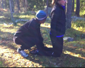 Vi joggade upp till masten där vi vek av in i skogen till vårt första stopp. Här fortsatte vi uppvärmningen med burpees; armhävningar och djupa hopp. Det var rejält pulshöjande och perfekt som uppvärmningstopp. Den första styrkeövningen var axellyft i par, den känns rejält både för den som gör motstånd och den som pressar. Sedan var det dags för magen, sidsparkar sittandes på rumpan. En av mina personliga akilleshälar, jag är lite svag i höftböjarna till förmån för rumpan. Därefter körde vi liggande rodd, den känns duktigt i överkroppen.